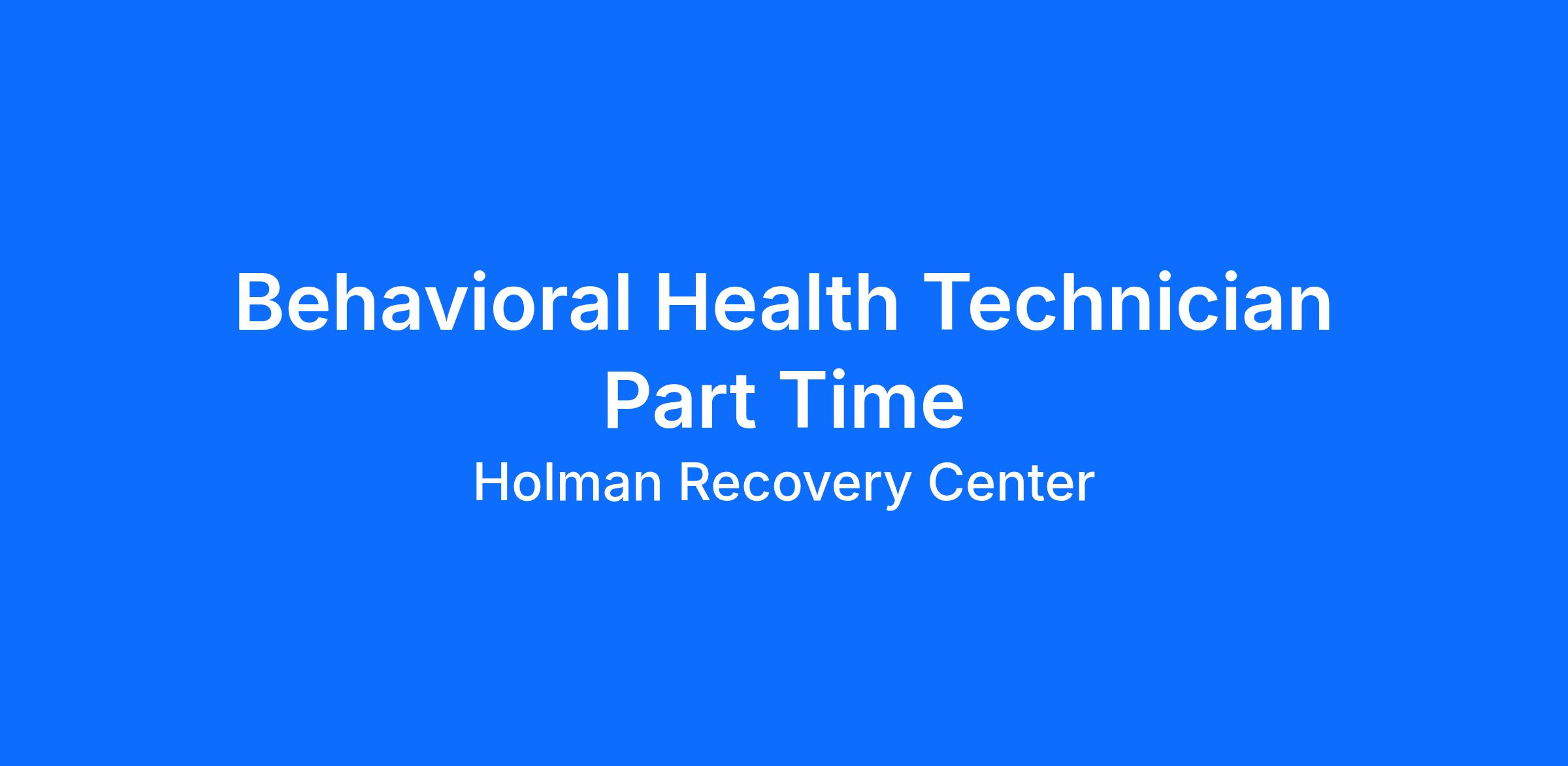 The Behavioral Health Technician (BHT) serves as a personal guide, and liaison for individuals with substance use disorders in Holman Recovery Center. The BHT supports clients by assisting them with identifying treatment needs, developing, maintaining, and monitoring individual treatment plans, and supporting clients to remain in treatment.