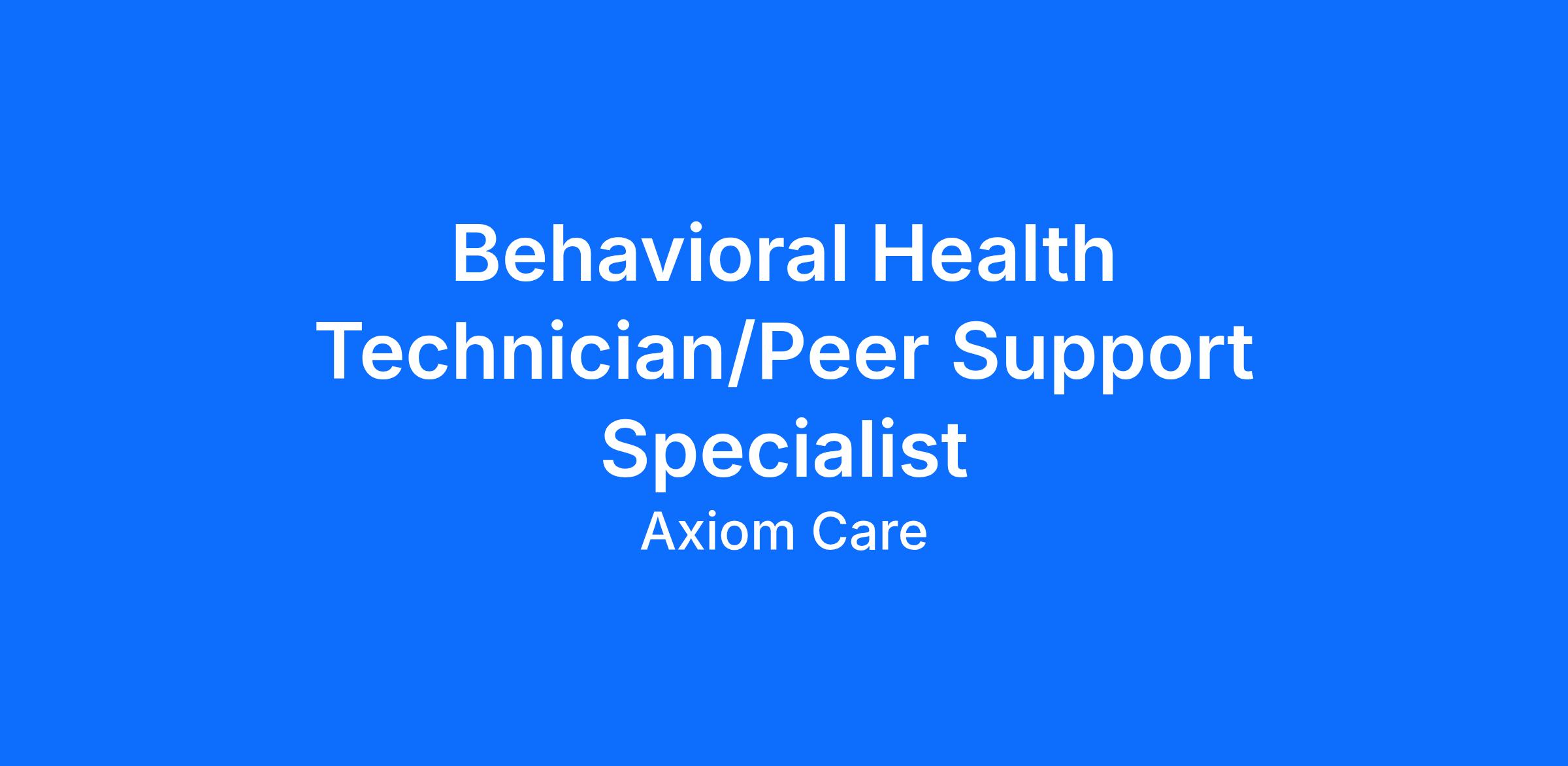 The Behavioral Health Technician/Peer Support Specialist works closely with the entire treatment team to provide high quality services to the clients we serve at Axiom Care. Those in this role provide direct services including psychoeducational group counseling, conduct biopsychosocial assessments and other assessments, safety planning and crisis intervention as needed, relapse prevention planning, discharge planning, and other therapeutic interventions within their scope. Indirect service includes attending clinical oversight, staffing, other meetings as needed, and completing all clinical documentation by the end of each shift.