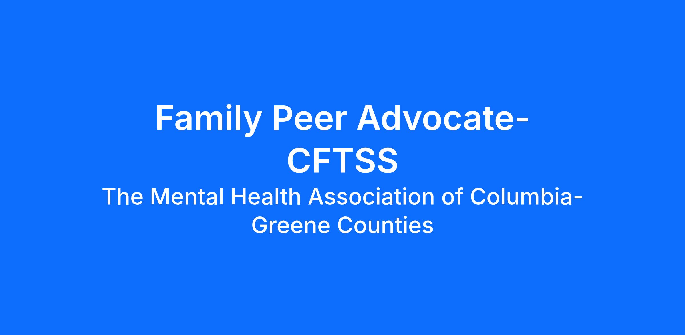 Are you a parent with a child that has a diagnosis? Are you looking for a rewarding career in Mental Health & Human Services? Apply today to join an amazing team, dedicated to advocating for the health & well-being of individuals, families, and communities. The Mental Health Association of Columbia-Greene Counties Inc. is looking to fill the position of Family Peer Advocate through Children and Family Treatment and Support Services (CFTSS).